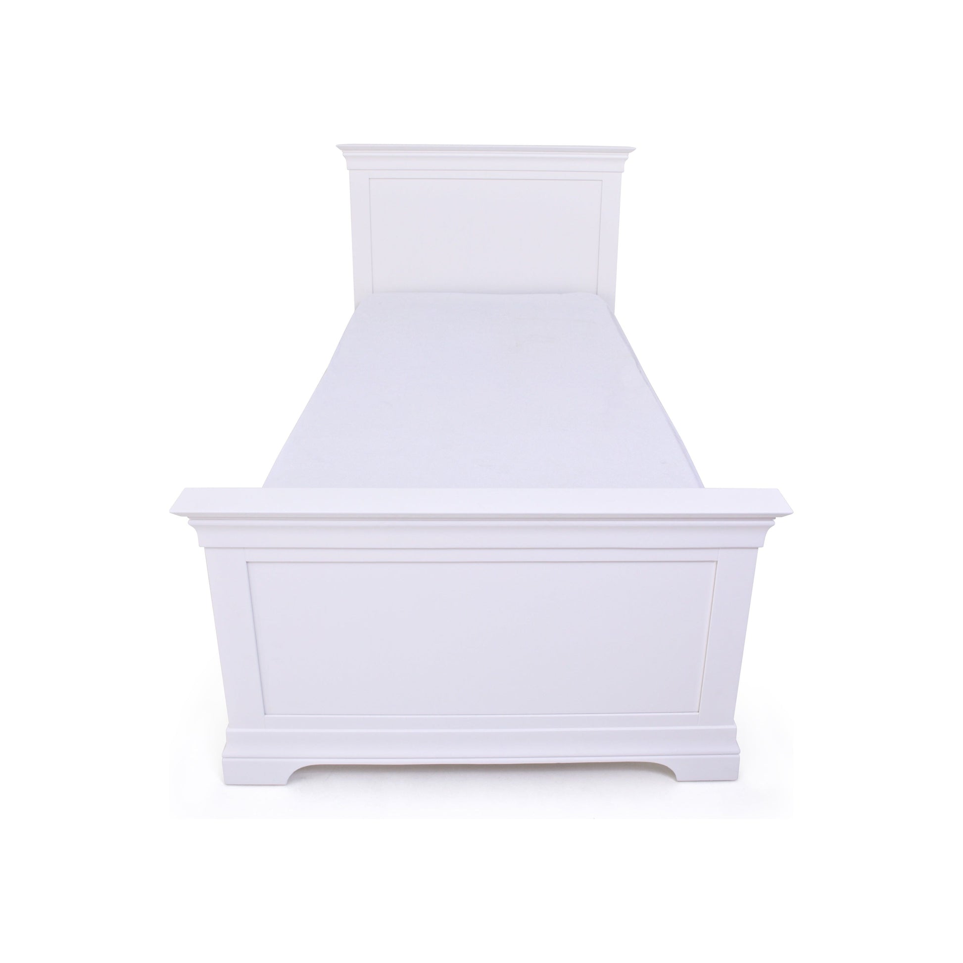 Envision yourself luxuriating on this stunning Chantilly White bed. You’ll relish in long, peaceful mornings and find reasons to indulge in afternoon naps. The bed is exquisitely crafted and painted in a soft white hue, providing a modern and rejuvenating aesthetic to help you create the tranquil retreat your bedroom should be. Its tall headboard offers ample support for sitting up and reading, while sturdy slats ensure its lasting durability. Just imagine how lovely our coordinating bedside tables will look on either side.
